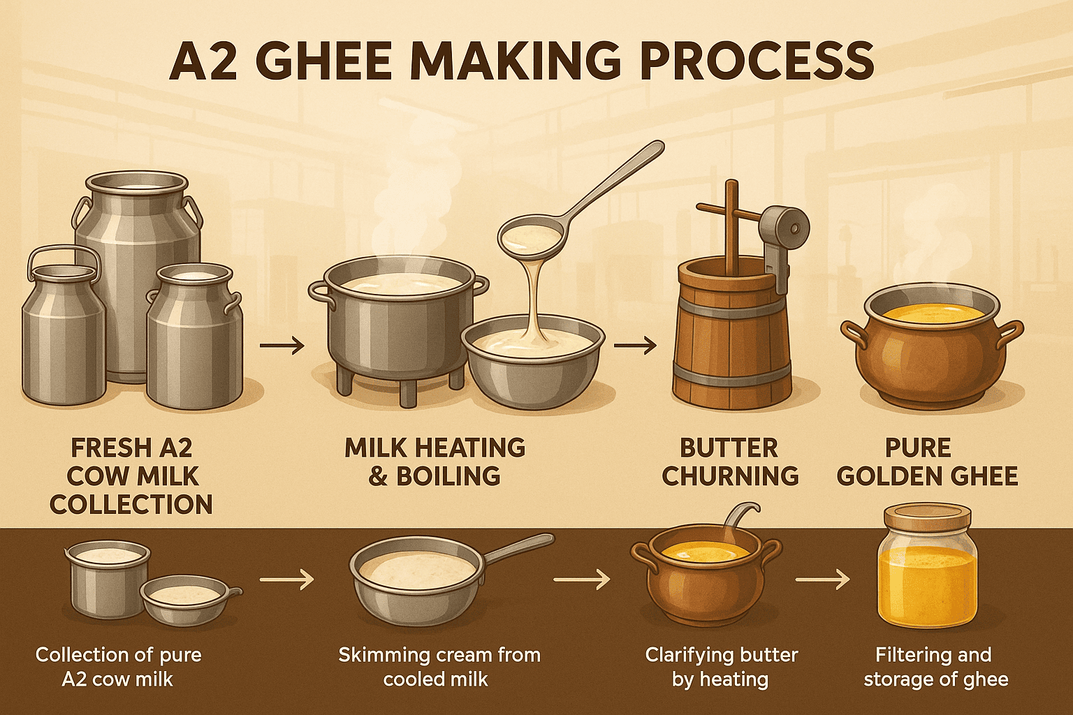 Hand-churned using the ancient bilona process where fresh curd is slowly churned with wooden churners, preserving all natural nutrients and maintaining the authentic taste that has been cherished for centuries.